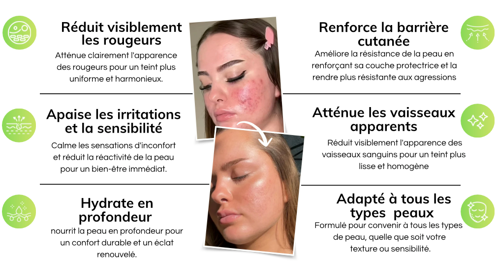 "Dès la première application, j'ai ressenti un soulagement immédiat et mes rougeurs ont diminué. Mon teint est désormais plus uniforme et ma peau plus résistante"